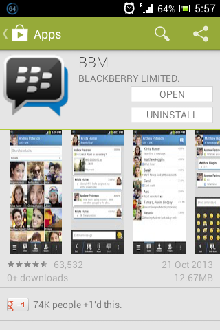 AJS Blog – BlackBerry akhirnya secara resmi merilis aplikasi BBM untuk Android. Sebelumnya aplikasi chat terkenal ini di jadwalkan rilis pada bulan September lalu. Namun, kini BBM telah bisa di download oleh pengguna Android di PlayStore atau disini. Berikut Tampilan BBM di PlayStore dan Tampilan BBM di Android