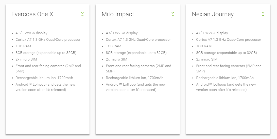 Andri-JS Blog – Android One, smartphone android yang disebut Nexus Mini. Android One telah dijamin oleh google untuk updatenya, seperti Nexus. Android One di jual di berbagai negara dengan kerjasama Google dan vendor lokal. Di Indonesia sendiri, vendor yang merilis Android One, ada Mito, Nexian, dan Evercoss. Semuanya memiliki spesifikasi yang sama. Berikut gambar dan Spesifikasi masing perangkat yang dapat dilihat di halaman resmi android one, http://www.android.com/intl/en-GB_id/one/