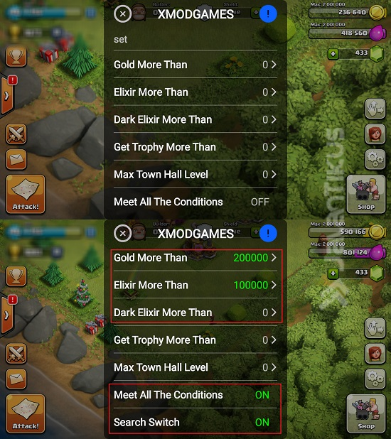 Disarankan melakukan setting yang tidak berlebihan, fungsi xmodgames hanya untuk melakukan skip terhadap gold atau elixir dan lainnya jika tidak sesuai keinginan. Xmodgames hanya membantu anda dalam menekan tombol Find Next. Dan lakukan setting yang masuk akal, jika kamu memiliki th level 8 atau 9, dan melakukan pencarian mendapatkan 500000 dari Town hall level 6 atau 7 itu sangan tidak memungkinkan, jadi diharapkan melakukan setting yang tidak berlebihan.