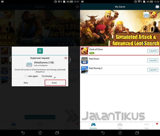 Jika sudah memenuhi syarat tersebut, silahkan download Xmodgames disini. Setelah itu buka Xmodgames dan jika ada pertanyaan dari aplikasi SuperUser atau SuperSU pilih Grant.