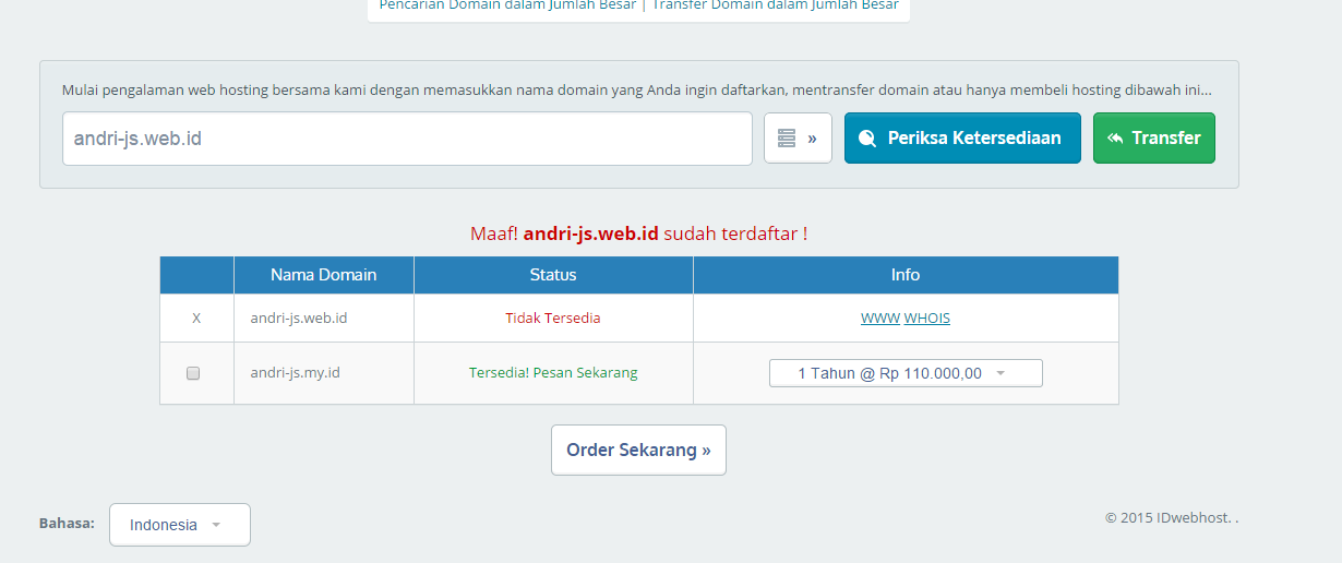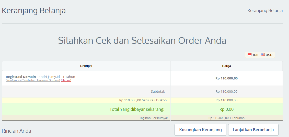 Andri-JS Blog – Domain Gratis? Bener gratis? Iya, domain .my.id Gratis dari IDwebhost. Ini berlaku untuk pembelian pertama. Tidak untuk perpanjang, jika anda ingin perpanjang akan dikenakan biaya Rp. 110.000 untuk tahun kedua. Itu di karenakan harga domain .my.id dari IDwebhost seharga Rp.110.000/tahunnya.